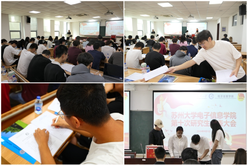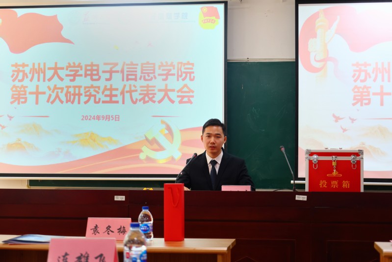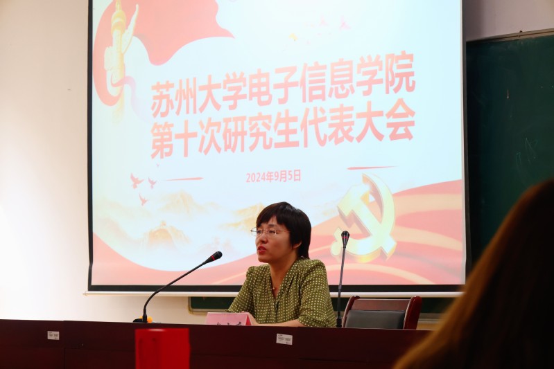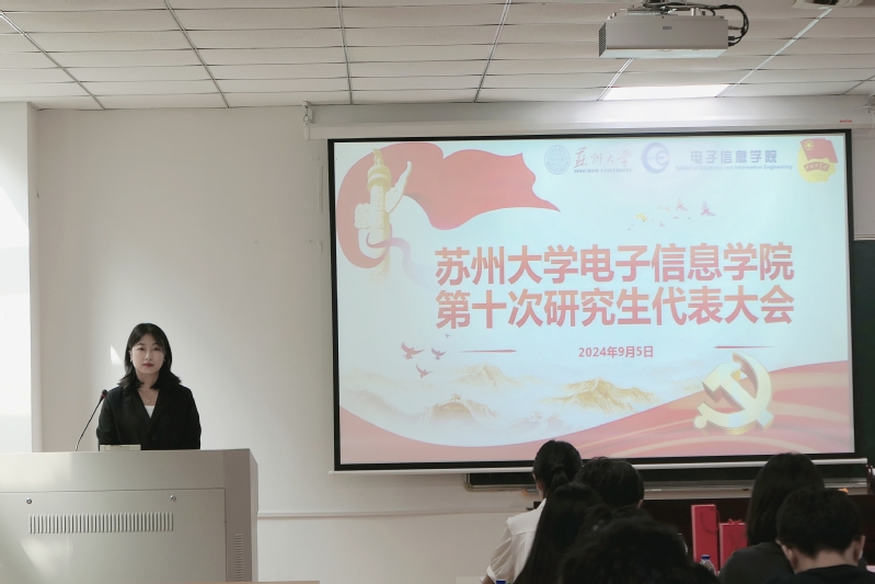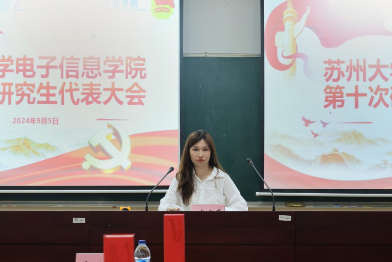 颜佳琪同学作《苏州大学电子信息学院第九届研究生会工作报告》,总结2023-2024学年学院研究生会在思想引领、组织建设、服务师生、开展活动等方面的工作成果,展望新学年的重点工作和奋进方向。