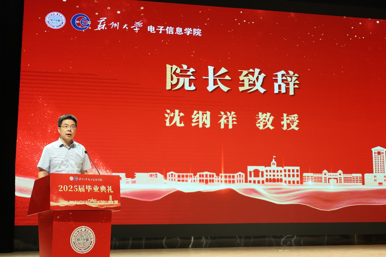 院长沈纲祥教授发表致辞,他代表学院向全体毕业生表示热烈祝贺,向辛勤付出的老师及支持毕业生的家长亲友致以诚挚谢意。他指出,学院始终秉持“品格高尚 专业精深”的院训,立足地方,构建起一流学科体系,同学们在学院不断成长,本科同学从懵懂少年成长为具备系统工程能力的科技人才,研究生同学在学术探索与工程实践中不断突破自我、攀登高峰。最后,沈院长殷切嘱托毕业生们要心怀大我、崇德尚学、终身学习,期望他们在电子信息领域书写精彩人生。