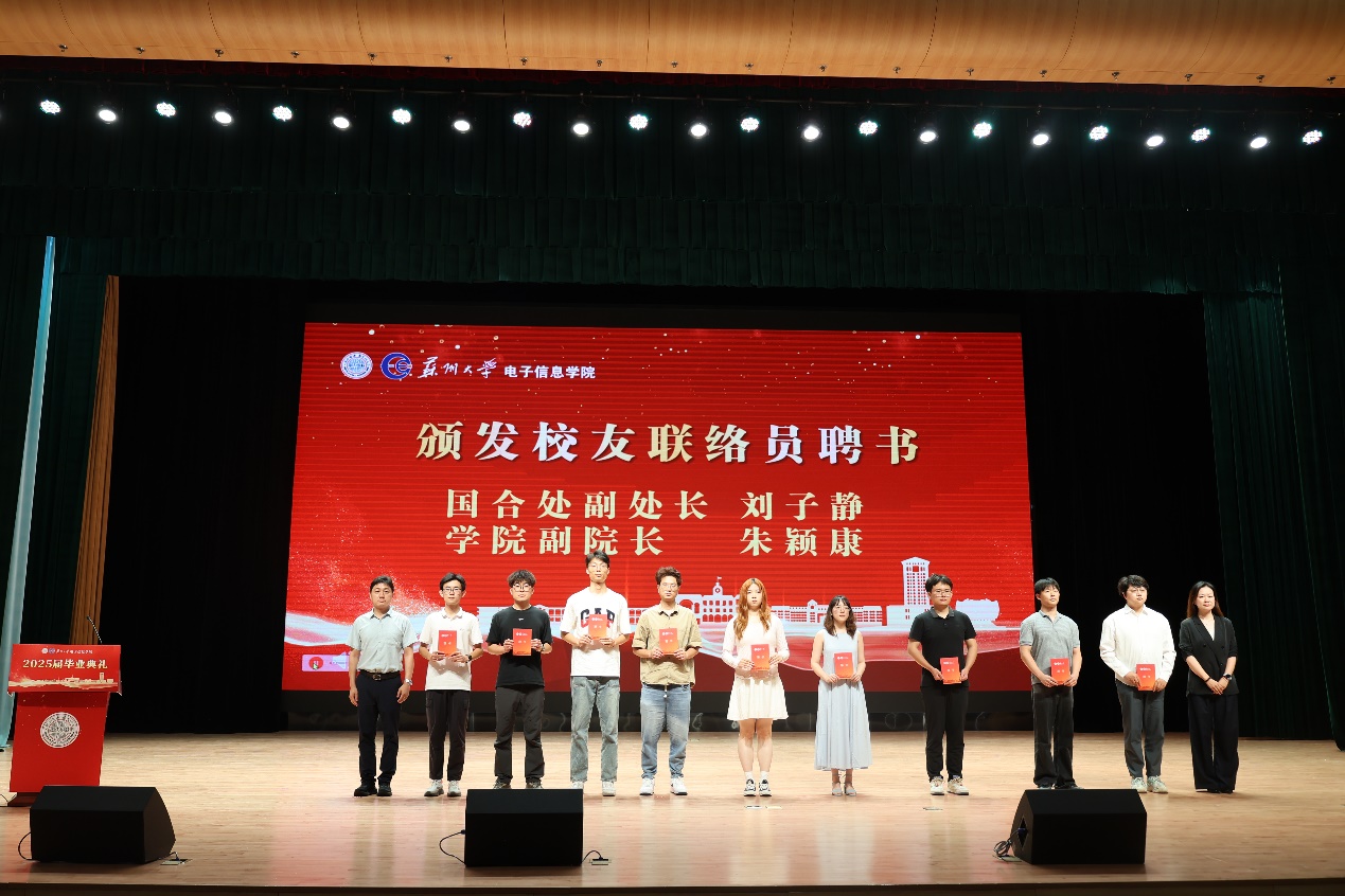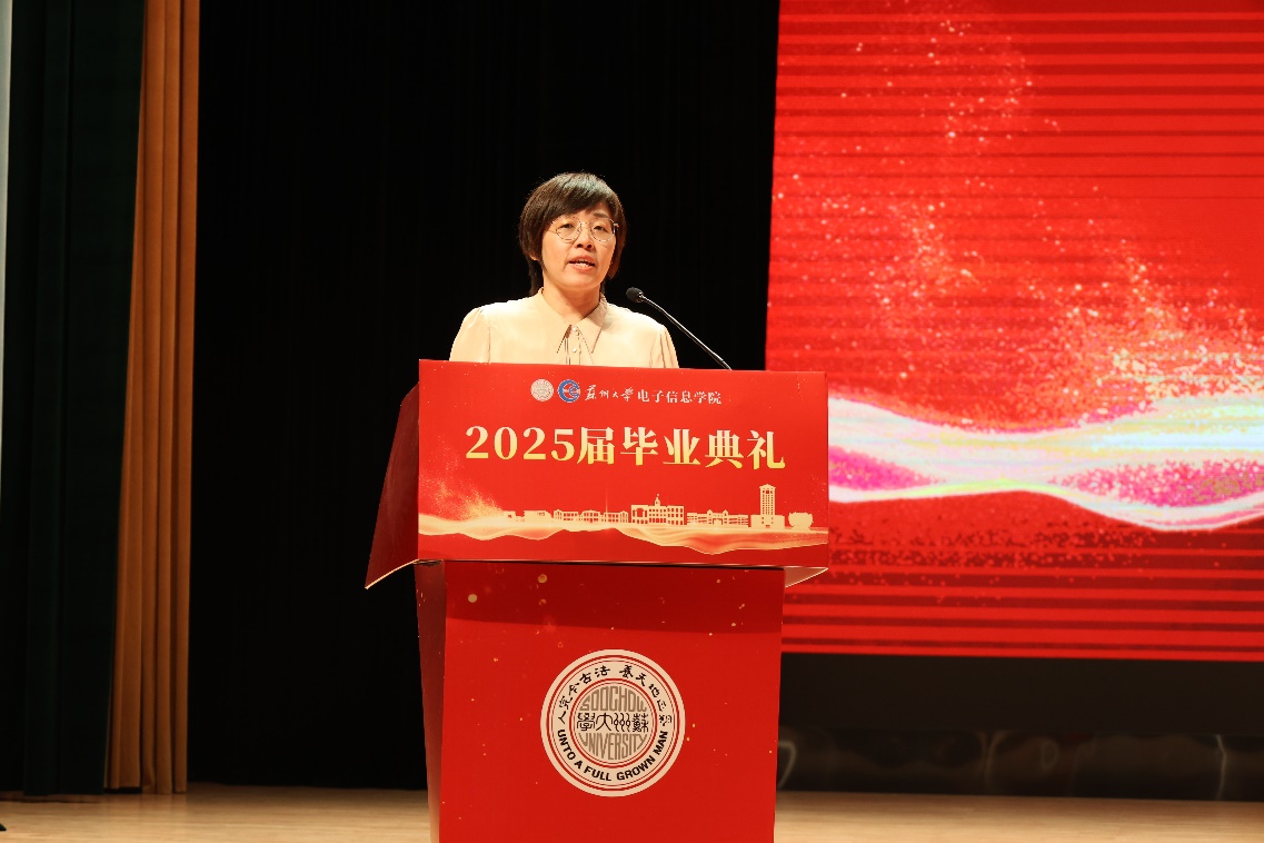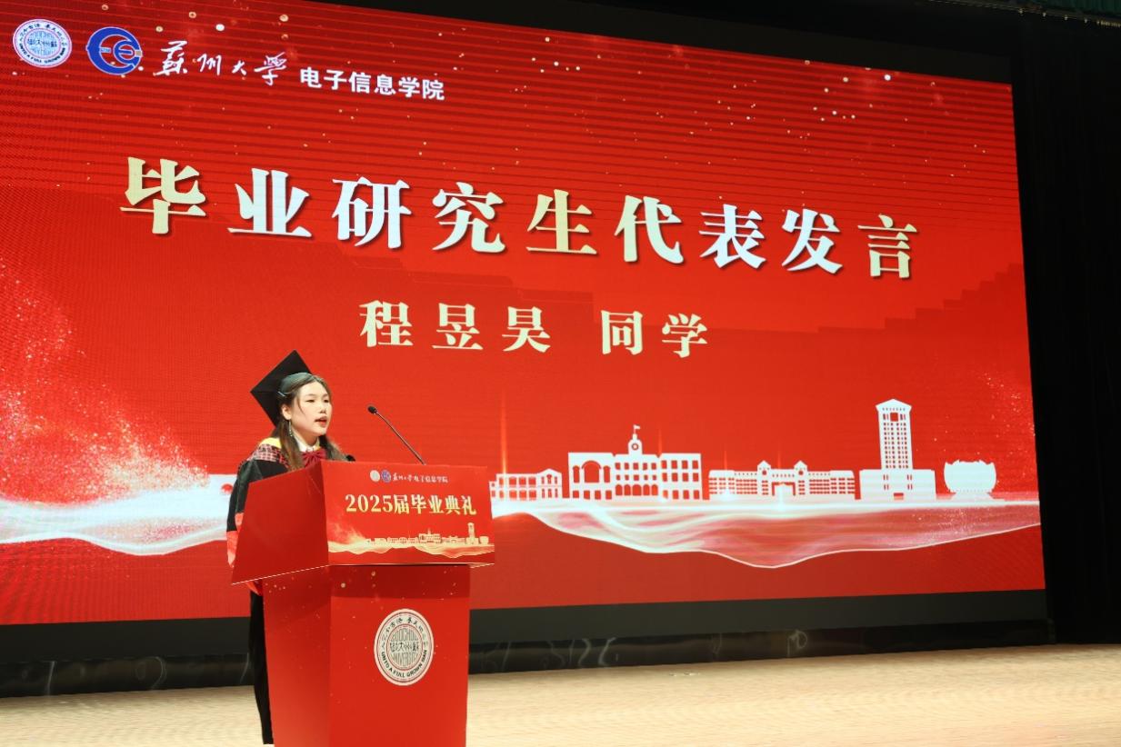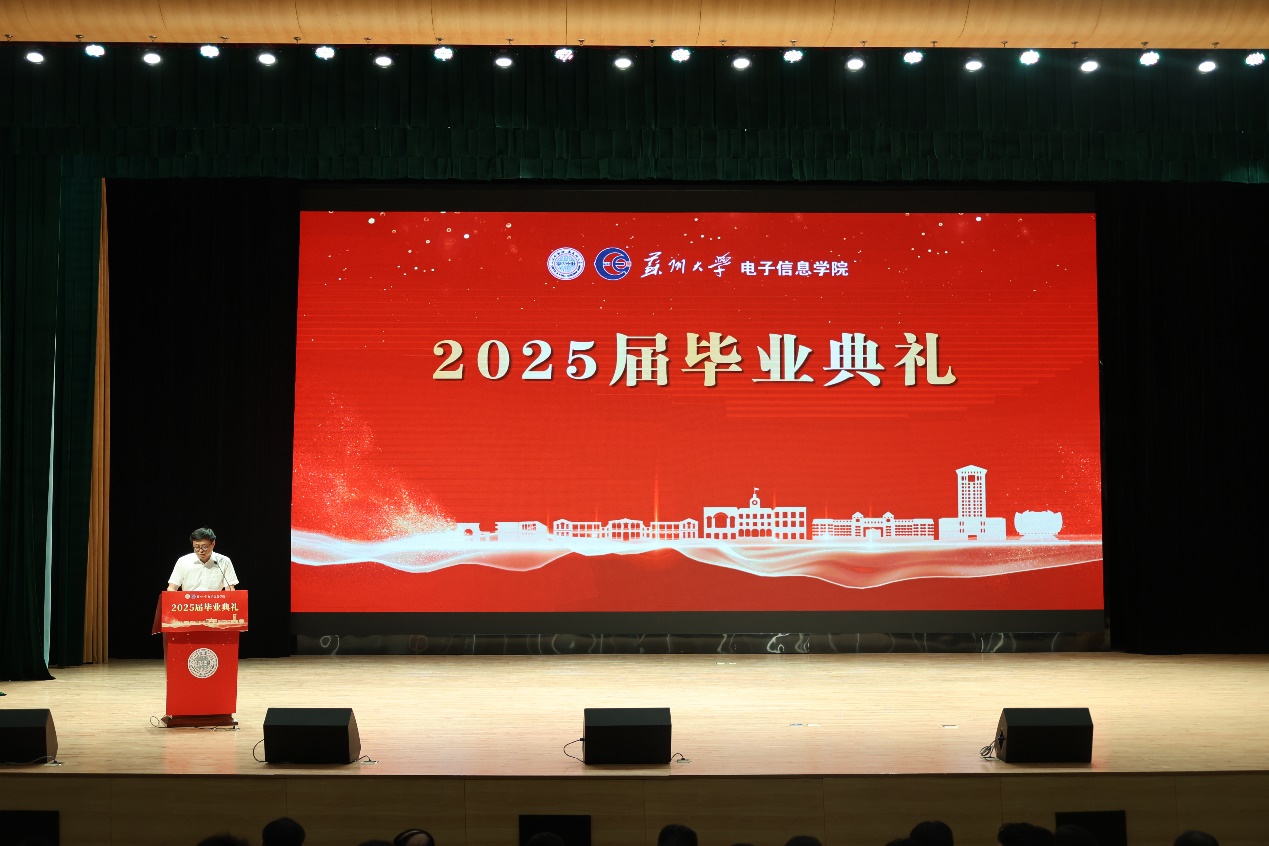 在庄重而热烈的氛围中,电子信息学院2025届毕业典礼圆满结束。全体毕业生带着母校的嘱托与祝福,即将奔赴祖国各地,在科技创新、产业振兴、教育发展等领域开启人生新征程。祝愿全体毕业生前程似锦、步履铿锵,带着苏大的印记与“E+”的温暖,在星辰大海的征途上乘风破浪,以电子信息人的智慧与担当,绽放属于2025届“芯青年”的璀璨光芒!