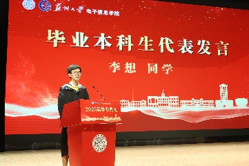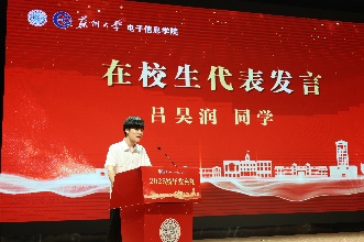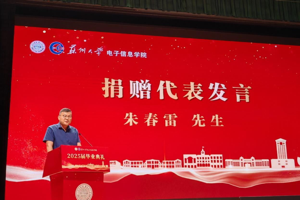 苏州格拉尼视觉科技有限公司总经理、优秀校友朱春雷先生作为捐赠代表发言,他祝贺毕业生并致谢师长,并回忆了苏大求学时光,提及校友网络的温暖,因对母校的感恩,2010届本科毕业生发起设立“E+”基金,搭建校友交流平台,传承苏大精神,助力学院发展。他还寄语毕业生心怀理想、勇于担当,情系苏大常回家看看。