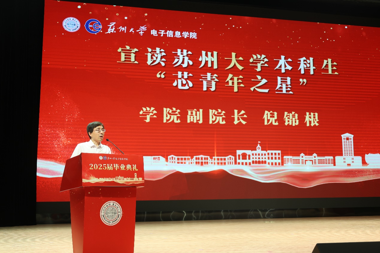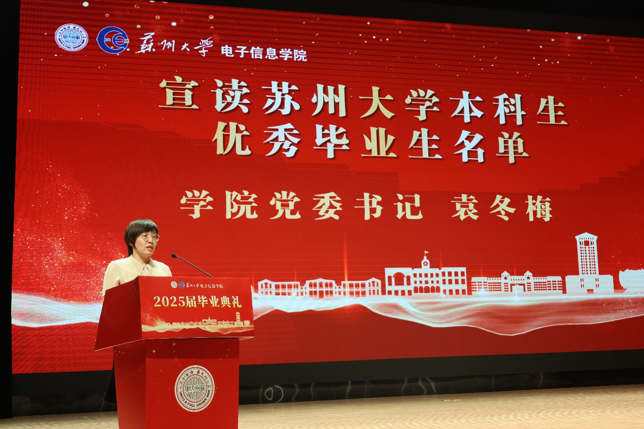 接着,党委书记袁冬梅宣读了苏州大学研究生优秀毕业生、本科生优秀毕业生名单及国内外升学主要去向高校。副院长倪锦根宣读了苏州大学“芯青年之星”和“E起超越”学霸宿舍获奖名单。