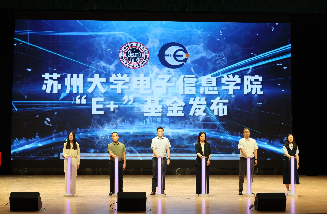 典礼现场举行了苏州大学电子信息学院“E+”基金发布仪式,学院院长沈纲祥、国合处副处长刘子静、苏州中源科达总经理王斌、苏州腾芯微电子有限公司CEO吴浩、邮政储蓄银行苏州工业园区支行副行长、2010届本科毕业生代表王婕妤、毕业生代表郭向露共同为本次“E+”基金发布仪式启幕。“E+”基金汇聚来自企业、校友、社会各界爱心人士以及在校师生的力量,为培养具有国际视野、创新能力的高素质电子信息人才提供坚实保障,标志着学院在构建社会协同育人体系中迈出重要一步。