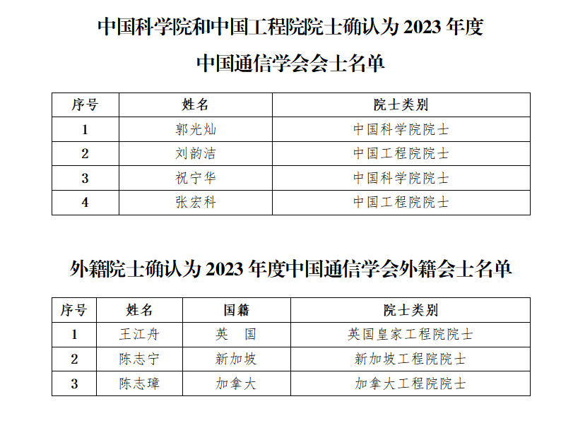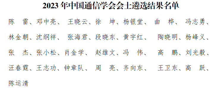 中国通信学会会士每两年遴选一次,每次遴选人数不超过30人,是中国通信学会会员的最高学术荣誉,其遴选程序非常严格,最终当选的会员必须被认为是“学术上有较深造诣,在信息技术领域及相关新兴交叉技术领域有重大发明创造,在研发、工程技术、教育、科技管理,以及行业管理、企业管理等方面有重大贡献”的学者。入选2023年度中国通信学会会士名单如下: