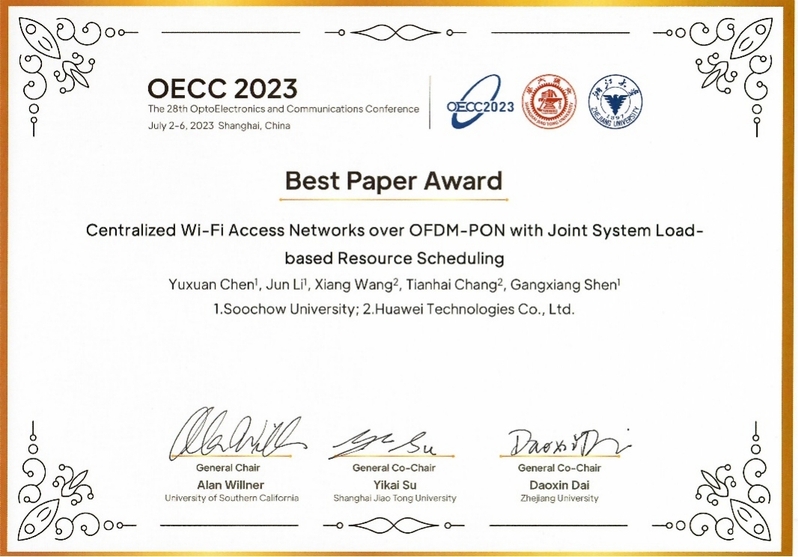 本次会议吸引了国内外多所知名高校和研究机构的专家、学者以及研究人员的参与。我院光网络技术研究中心多名师生参与会议并作口头汇报,与国内外学者进行广泛的学术交流。本次会议分设5个专题,共评选出3篇最优论文。在沈纲祥教授和李军博士的指导下,我院22级研究生陈雨轩(原中心本科生)提交的题为《Centralized Wi-Fi Access Networks over OFDM-PON with Joint System Load-based Resource Scheduling》 的论文获得最优论文奖(Best Paper Award)。
