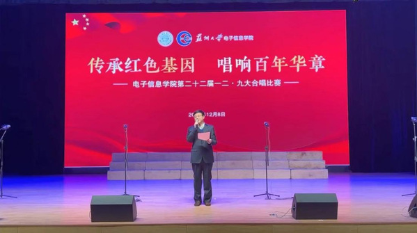 在院新生舞蹈队带来的舞蹈《忠魂》开场后,院党委副书记、副院长黄远丰老师为本次大合唱比赛致辞,他从个人对“一二·九爱国主义精神的理解讲起,给予了同学们殷切的期望:作为新时代青年,电院学子应不断增强集体荣誉感,在团结协作的基础上,传承好“一二·九”爱国主义精神,让“一二·九”爱国主义的火苗生生不息,将“一二·九”爱国主义的使命牢记于心!