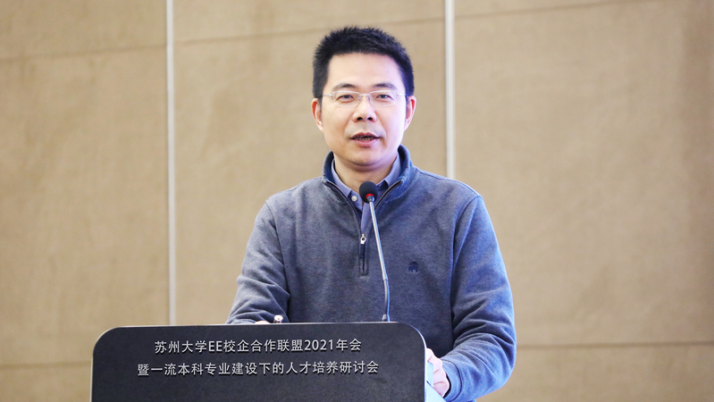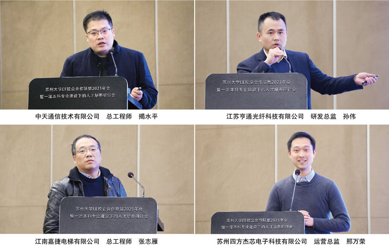 中天通信技术有限公司总工程师揭水平等四家联盟成员单位代表发言。他们分别介绍了各自企业的基本情况、战略定位、创新成果等,表示在人才培养的目标上,企业和学校具有共同的使命和责任,将充分利用苏州大学EE校企合作联盟平台,深化合作交流,实现学校、企业和学生三方共赢。