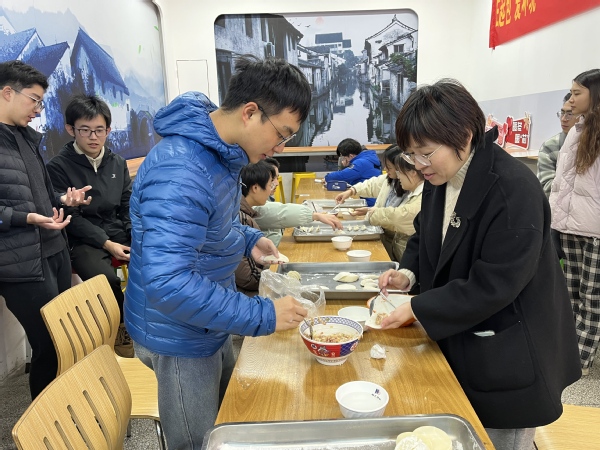 12月18日下午,学院研究生党支部、研究生会联合本科生党支部共同开展“E起包,爱环绕”暖冬包饺子活动。13名研究生国奖获得者与本科四年级推免学生们齐聚莘园食堂,在包饺子、吃饺子的过程中,围绕研究生生涯的学业、科研、生活各方面内容进行交流。在交流中,本科生们提出自己对于研究生生活的期待与担忧。研究生学长学姐一一耐心解答,给予真诚而具体的建议。学院党委书记袁冬梅、副院长倪锦根出席活动,并与同学们展开亲切交流。
