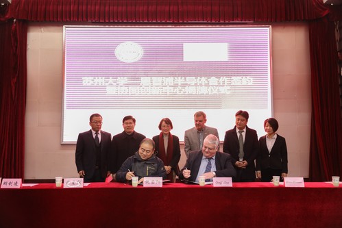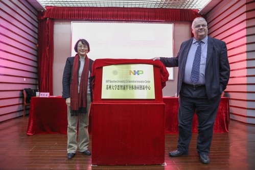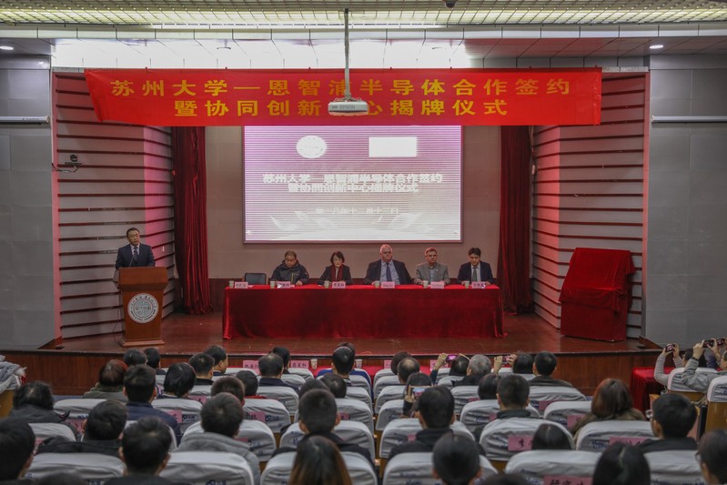 12月13日下午,苏州大学—恩智浦半导体合作签约暨协同创新中心揭牌仪式在天赐庄校区红楼会议中心学术报告厅举行。恩智浦半导体全球高级副总裁、微控制器事业部总经理Geoff Lees、全球副总裁Brian Branson、苏州研发中心总监万郁葱及公司相关负责人和研发团队,我校副校长蒋星红、“2011”计划办公室主任仇国阳、电子信息学院领导及师生代表出席了本次会议。会议由电子信息学院院长胡剑凌主持。