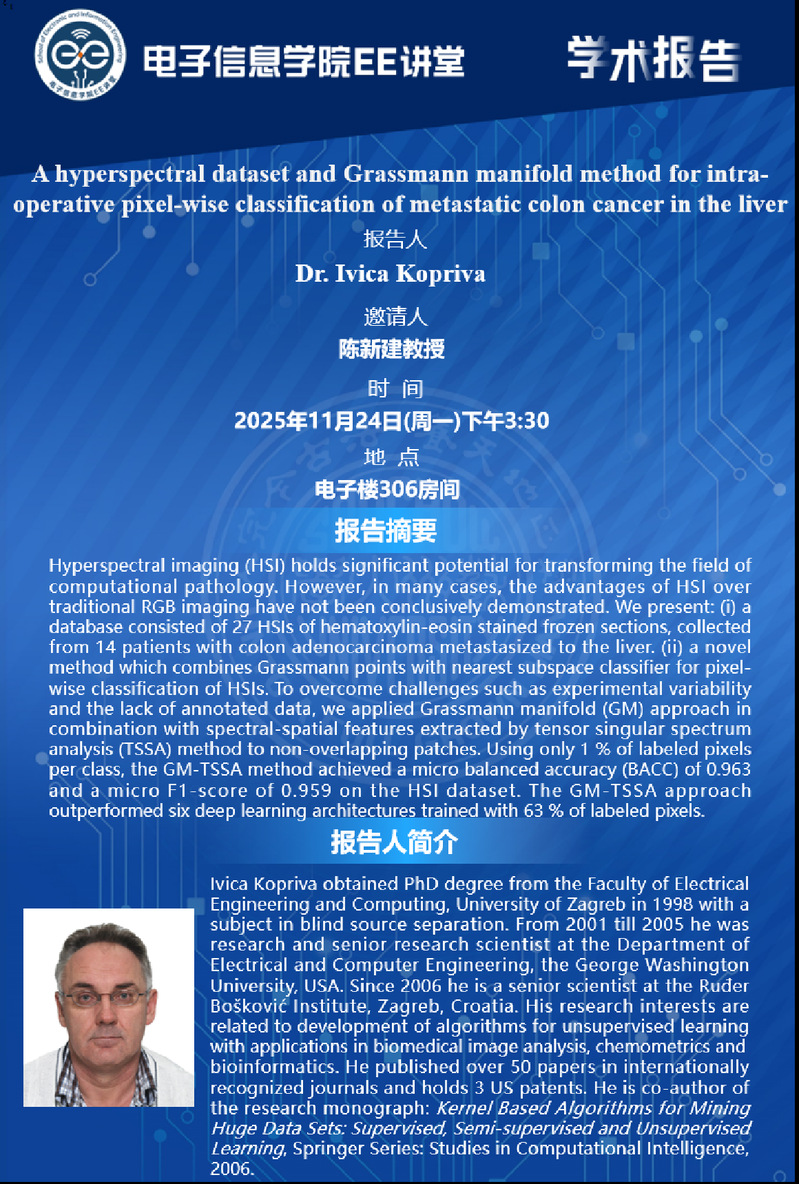 【学术报告】A hyperspectral dataset and Grassmann manifold method for intra-operative pixel-wise classification of metastatic colon cancer in the liver