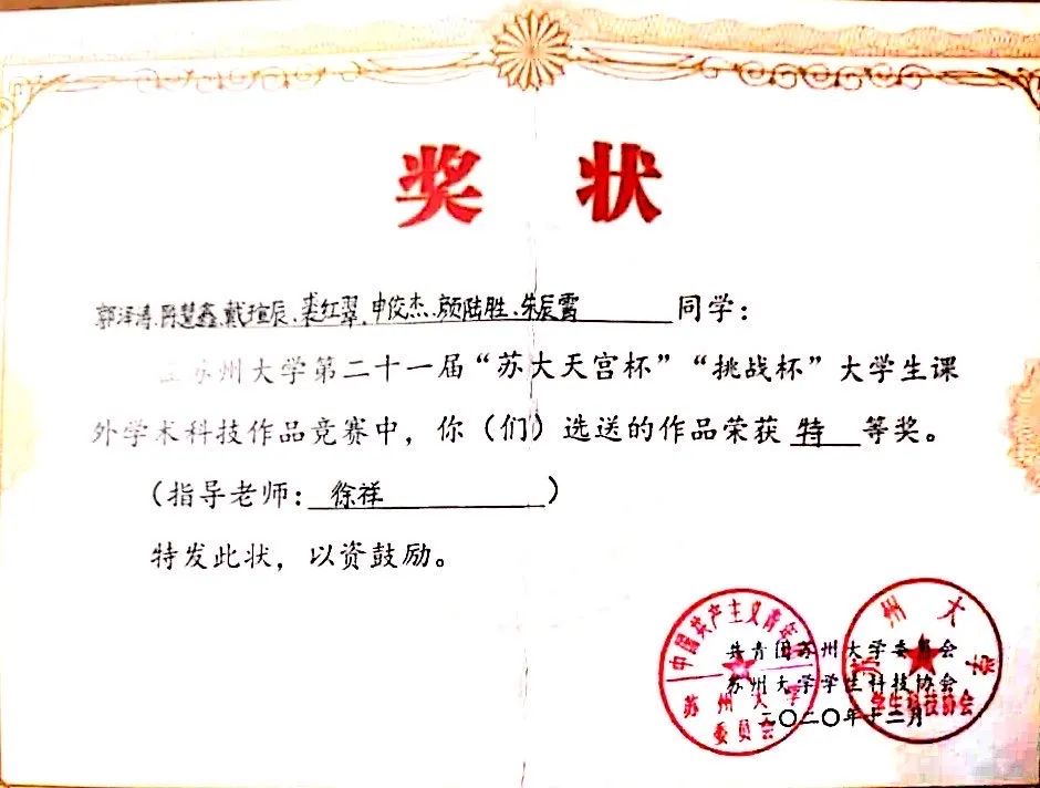 团队成员抱着啃硬骨头的态度准备省赛,不断学习新知识,积极与老师沟通,结合专业知识,不断尝试,改进方案,获得第十七届江苏省“挑战杯”大学生课外学术科技作品竞赛特等奖!