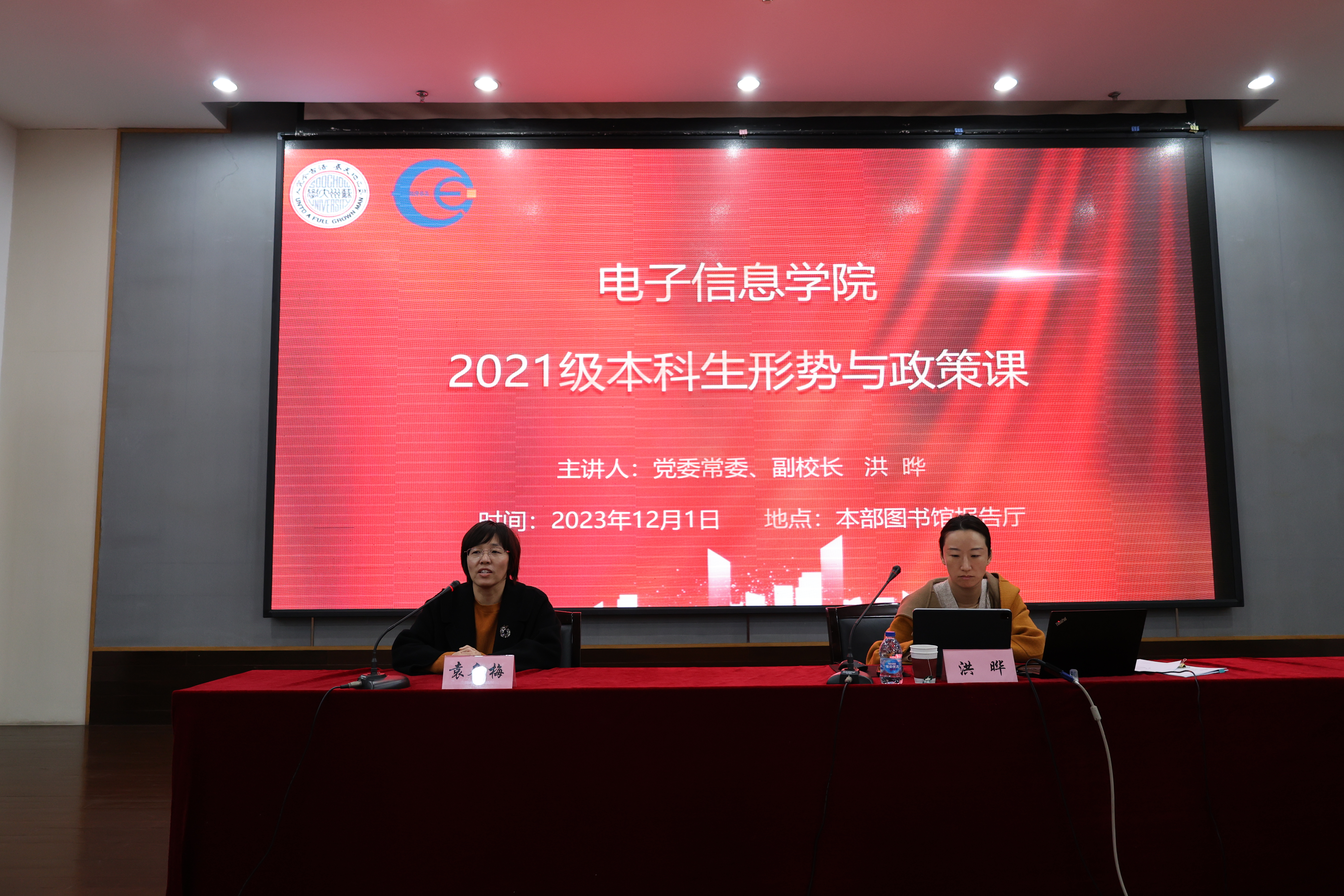 12月1日晚上,电子信息学院形势与政策课在本部图书馆报告厅开课。学校党委常委、副校长洪晔以“世界变乱交织、中国笃行担当”为题向学院2021级本科生授课,课程由学院党委书记袁冬梅主持。