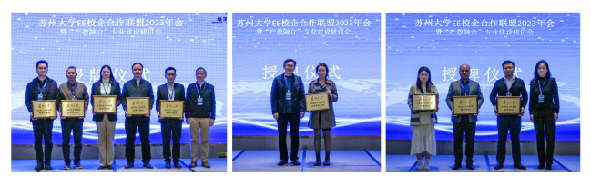 会议期间,苏州大学EE校企合作联盟为新加盟的会员单位授牌,苏州四方杰芯电子科技有限公司运营与市场总监、源予半导体南京有限公司总经理邢万荣和中国银行股份有限公司苏州工业园区分行罗天纯经理作为会员单位代表作了主题发言,与会其他代表结合公司情况和本次会议主题也展开了讨论交流,纷纷表示将全力支持学校建设和发展,实现高校和企业的资源共享和优势互补,双向奔赴推动电子信息产业的持续创新升级。