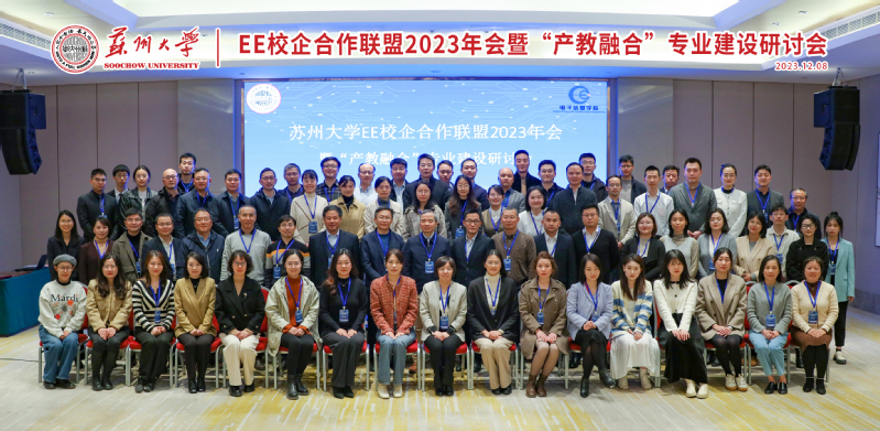 姑苏天气暖,冬月有朋来。2023年12月8日下午,苏州大学EE校企合作联盟2023年会暨“产教融合”专业建设研讨会顺利召开。苏州大学党委常委、副校长沈明荣,苏州市工信局电子信息处处长刘子印、副处长胡婧,苏州大学国内合作发展处副处长刘子静、苏州大学EE校企合作联盟60余家单位代表以及电子信息学院领导班子和教师代表出席了此次会议。会议由电子信息学院副院长朱颖康主持。