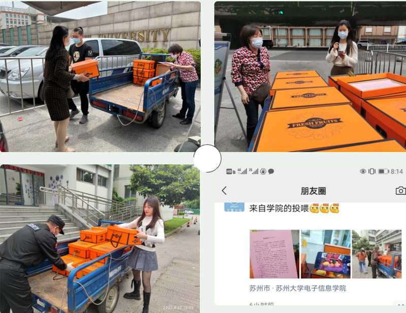 4月27日中午,针对住校师生缺少水果的问题,学院快速响应,积极部署落实,将水果和《致住校师生的一封信》送至住校师生手中,让他们感受来自学院大家庭的温暖。在此过程中,学校保卫处给与了大力支持,保安大叔协助外包装消毒,并用三轮车一一送至宿舍区楼下,确保学生吃得安心,吃得舒心。