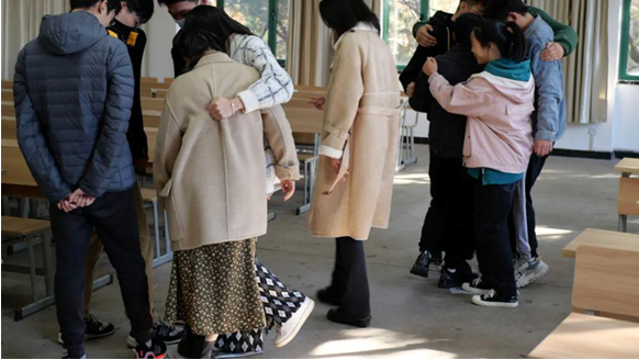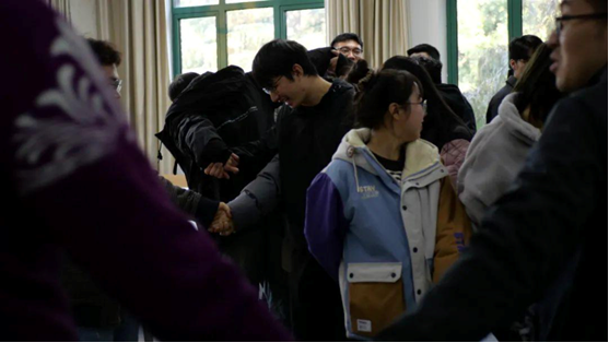 “解手结”游戏环节,所有人手拉手先围成一个圈,随后随着音乐的播放开始随意走动,音乐停止后,大家需站在原地和最初左右两侧的同学再次牵手,并齐心合力解开手结。