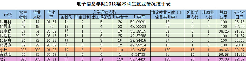 二是贴近学生中、短期发展的各种需求,外联内协创条件,2014级本科毕业生升学率较2013级毕业生的29.2%大幅提升至42.2%,起薪薪资也进一步大幅提升,平均月薪超过6500元(不完全统计),高于全校工科平均水平,个别学生年薪接近30万元/年;三是不折不扣落实学校关于学风建设的若干意见,多措并举想办法,毕业率进一步提高,应届生毕业率由前一年的90.4%提升至91.9%;四是紧跟电子信息行业人才需求状况,同心同向谋认同,2018届共有26人考取公务员、自主创业、二战考研等未专业对口就业或未就业,专业对口就业率高达92.07%。