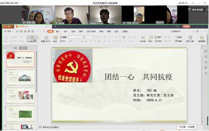研究生第一党支部博士生党员卜峰说:“居家科研要划分好学习区与生活区以避免太多干扰,要充分利用网络资源阅读相关文献,要定期与导师交流。”硕士生党员安景慧为同学们分享了文献搜集的一些实用小技巧。第二党支部王必成说:“我们研究生党员应该正确树立社会责任意识、学术责任意识、文化责任意识、他人责任意识和生命责任意识。”此外,第三党支部张淼、第四党支部庞婕作为毕业年级党员分享了居家做毕业论文的感想和经验。