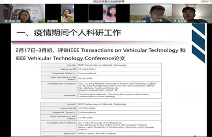 2020年4月17日晚7点半,电子信息学院研究生党支部举行云端联合主题党日活动,4个党支部上百名研究生党员共同在线参与。本次活动由研究生第二党支部书记倪成润主持,共分为“携手抗疫话担当”、”居家科研话担当”、副院长微党课——“特殊时期如何做好自我管理”三个部分。
