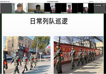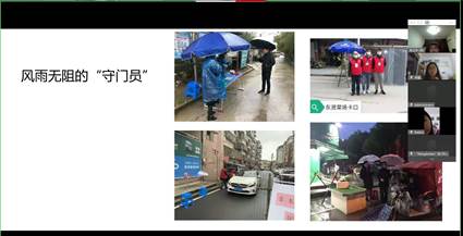 研究生第一党支部尹湘媛哽咽着分享了同村村民李光方同志连续奋战在村里抗疫一线30多天,因劳累过度而突发心脏衰竭牺牲的感人事迹。温祖翔分享了几则在“学习强国”中看到的“抗疫“先锋故事。研究生第二、第三党支部刘仁雨、吴倩、仲洋、鲍登森、郑乐松分享了各自作为家乡”抗疫”志愿者的服务行动和心路历程。积极响应党和国家号召,在家乡“抗疫”人力匮乏时,第一时间主动报名投身“抗疫”一线,是他们作为新时代青年党员神圣光荣的义务和坚定无悔的选择。守土有责、守土负责、守土尽责,再辛苦都是值得的。研究生第四党支部的3位入党积极分子沙炎平、朱立宇、倪珅晟也同样加入了家乡志愿者队伍,他们分别用PPT展示了作为家乡不分昼夜的“信息员“、不辞辛劳的”宣传员“、风雨无阻的“守门员“的志愿故事,用实际行动表达了加入中国共产党的决心。