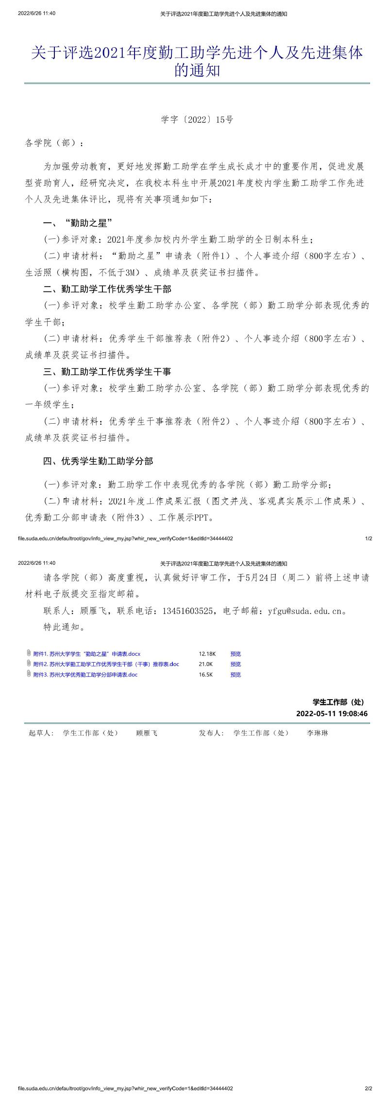 关于评选2021年度勤工助学先进个人及先进集体的通知