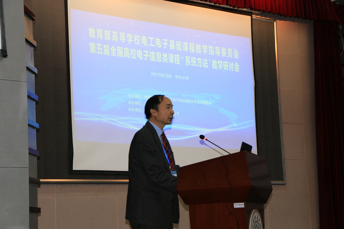 10月21日上午,研讨会开幕式在苏州大学红楼学术报告厅拉开帷幕,与会的嘉宾有:教育部高等学校电工电子基础课程教学指导委员会主任委员东南大学王志功教授、上海交通大学朱杰教授、华南理工大学殷瑞祥教授、电子科技大学李玉柏教授、西北工业大学李辉教授和机械工业出版社华章分社副编审王颖女士等。我校党委常委、纪委书记芮国强、教务部部长周毅、电子信息学院院长赵鹤鸣等出席,会议由电子信息学院副院长胡剑凌主持。