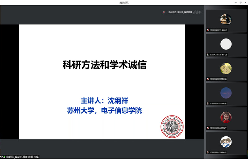 院长“开学第一课”由电子信息学院倪锦根副院长主持,倪副院长首先对2022级研究生新生的到来表示欢迎,并指出在不同阶段学习重点和方式都有所不同,研究生阶段不仅仅是学习已有的知识,更重要的是在以后的科学研究中培养自己独立思考的能力,进而提出新理论、探索新方法。在如何认识科研、如何做好科研和如何在科研道路上行稳致远,沈纲祥院长从科研的重要性、从事科研工作的步骤、科研体会和学术诚信四个方面讲述了学术科研的大学问。