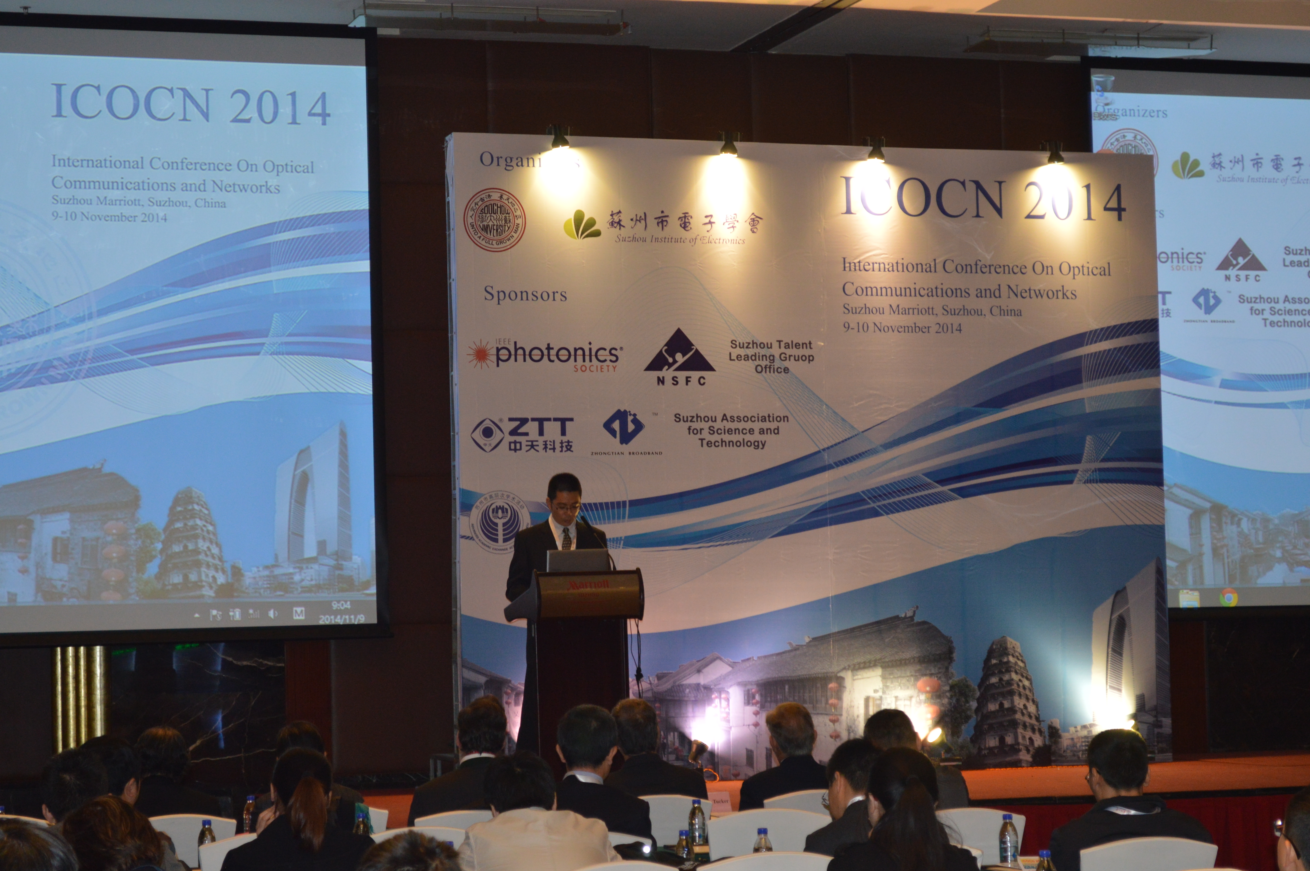11月9-10日,由苏州大学和苏州市电子学会共同主办,苏州大学电子信息学院光网络技术研究中心承办的第十三届国际光通信和网络会议(The 13th International Conference on Optical Communications and Networks, ICOCN 2014)在苏州举行。