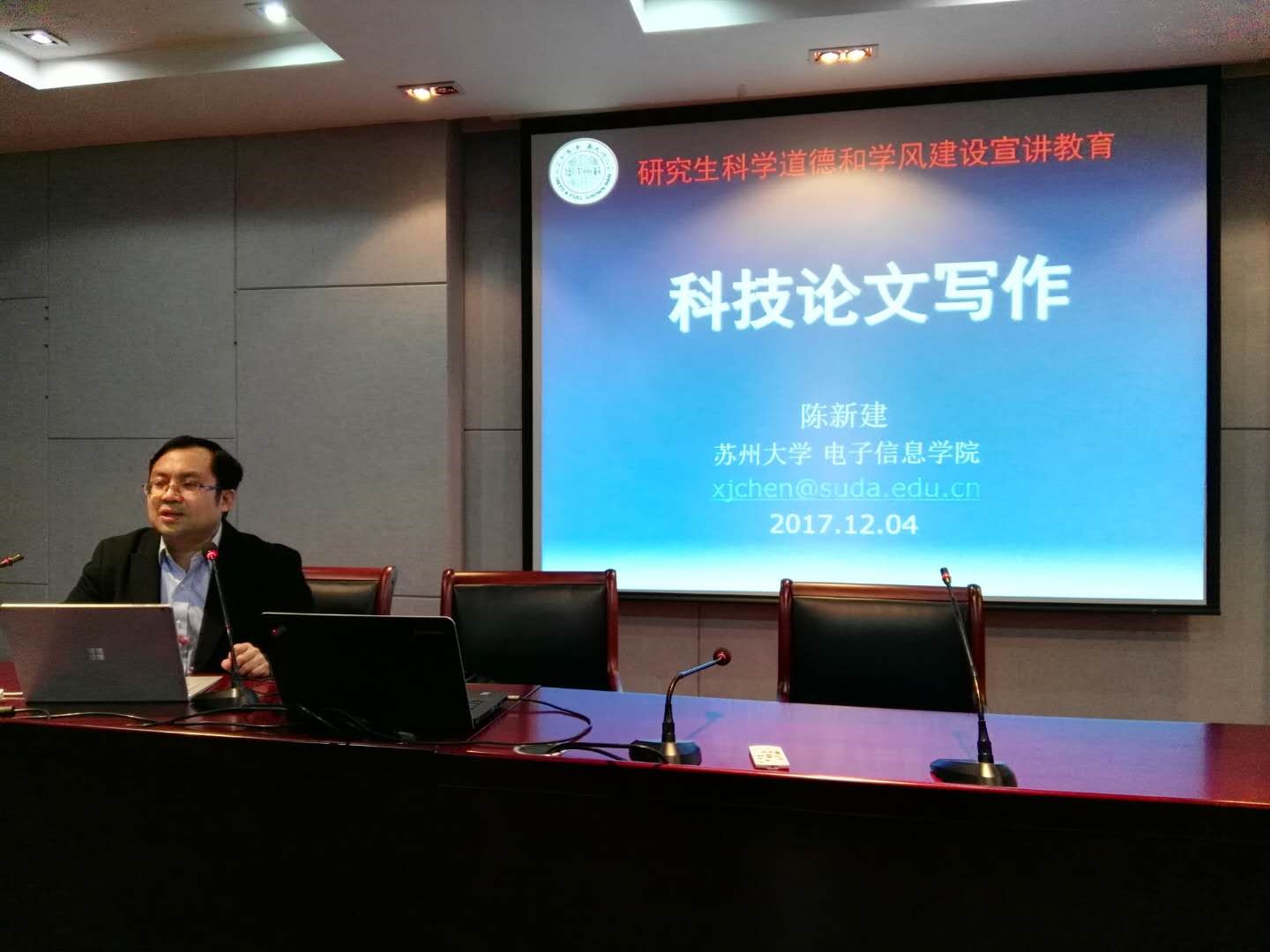 接着,陈新建教授围绕《如何写好科研论文》给大家作了一场准备充分、内容丰富、条理清晰的辅导报告。他的报告分为中英文两个部分,中文内容包括以下几方面:一、科技论文的定义,科技论文是指对创造性的科研成果进行理论分析和总结的科技写作文体。特点是具有创新性、新知识和新进展、新成果。二、科研论文的分类,科技论文根据其发挥的作用可分为学术性论文、技术性论文、学位论文和其它论文四类,按研究方式和论述内容可分为试验研究报告、理论推导、理论分析、设计计算和综合论述五类。三、科研论文写作和发表的意义,在于它是人类科研成果的总结和交流,能造福于人类,当然每个人对于发表论文的意义和看法也会有所不同。四、科技论文必须具备的特点,要有创新性、学术性、科学性、准确性、规范性与可读性。五、科技论文的写作要求。科研论文的结构包括引言、正文、结论、致谢、参考文献、附录等,每一部分都应符合规范化的特定要求。英文部分包括以下几个方面:一、写一篇高质量文章,要从前期准备、文章结构、语言、技术细节等方面入手。二、修改和回复审稿人。要重视审稿人意见,认真修改文章。三、伦理道德问题。科研不多弄虚作假,不能出现一稿多投等现象。四、最后用”ACCEPTANCE”的字母总结了10条注意事项,对讲座进行了总结。