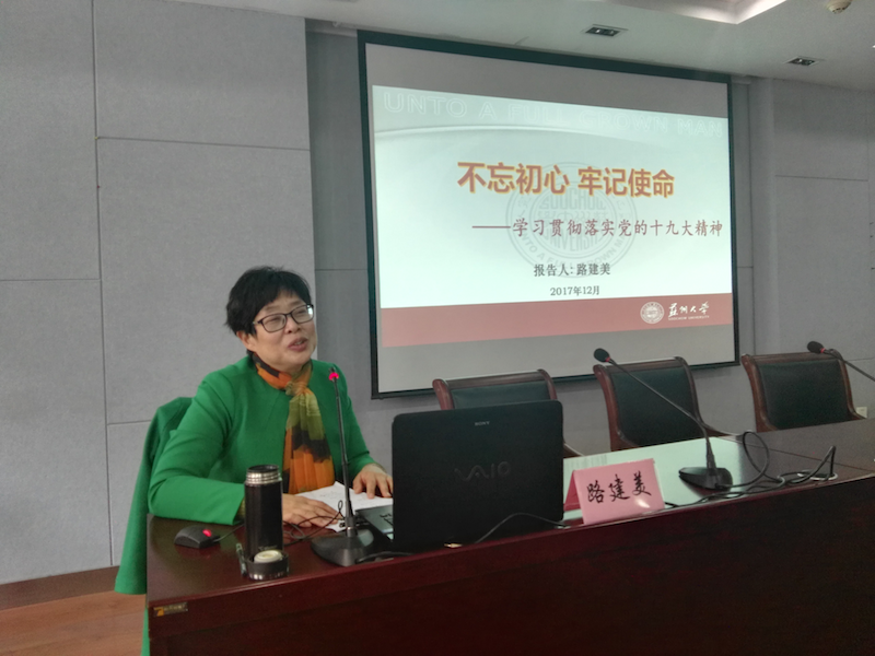 12月20日下午,苏州大学党的十九大精神宣讲团成员、校党委副书记、副校长路建美来到电子信息学院,以《不忘初心,牢记使命——学习贯彻落实党的十九大精神》为主题,为全院教职工作了学习宣传贯彻党的十九大精神专题辅导报告。宣讲会由学院党委书记徐群祥主持。