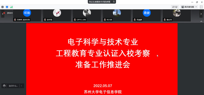 2022年5月7日,我院线上召开了电子科学与技术专业工程教育专业认证进校考察准备工作线上推进会。学院院长沈纲祥、书记袁冬梅、教学副院长陈小平、电子科学与技术系主任徐大诚、副主任张冬利、教务办主任郭晓雯以及电子科学与技术系全体教师参加会议。